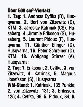Im Jahr 1990 bestritt er die komplette Weltmeisterschaft und ging letztmalig bei den Six Days im schwedischen Västeras an den Start. Dies war auch der einzige Start für die Trophy-Mannschaft der BRD. Hier gelang dem Team um Jens Scheffler, Harald Sturm, Uwe Weber, Armin Sponsel, Bert von Zitzewitz und Andreas Cyffka ein 4. Platz.